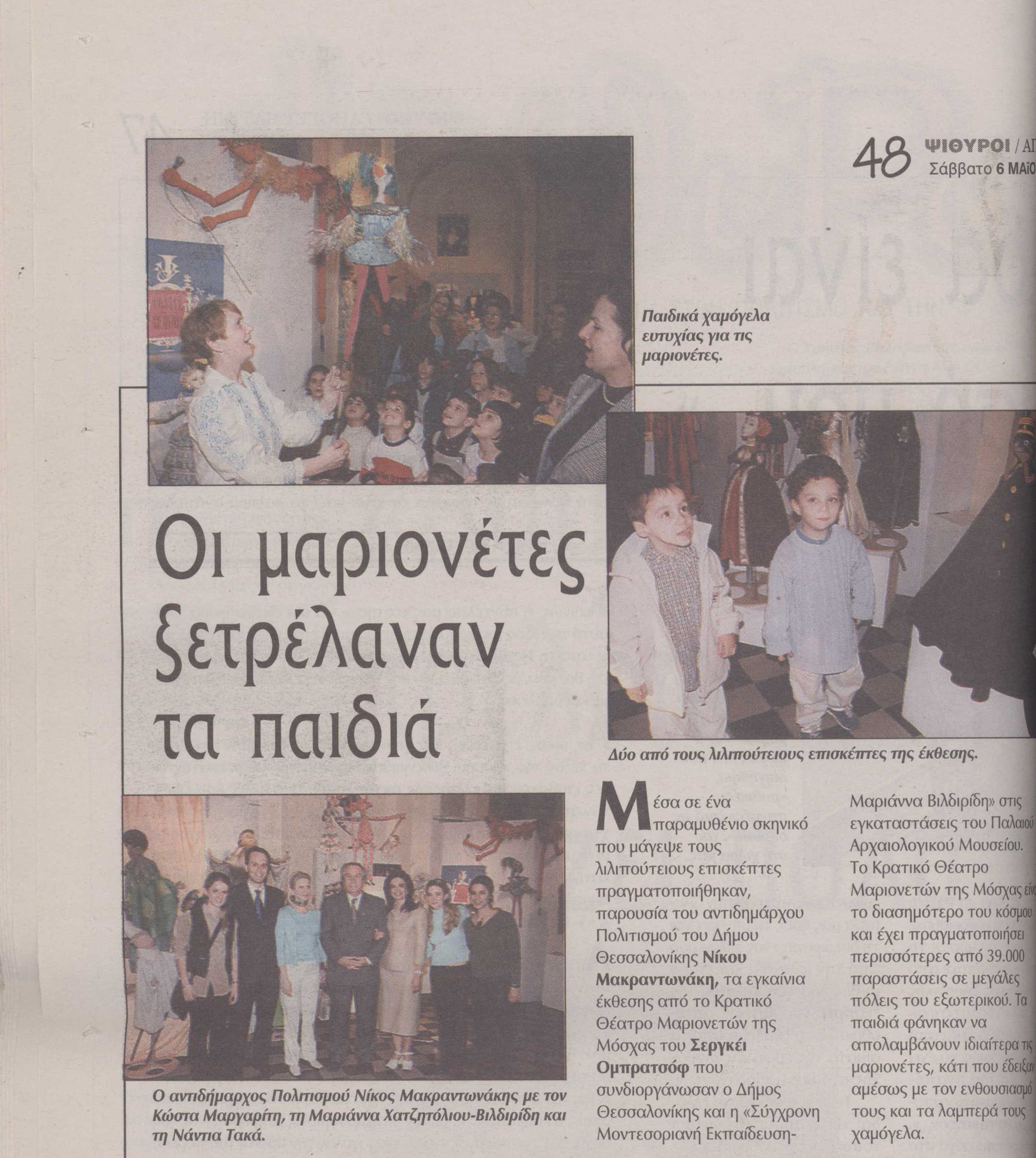 Μέσα σε ένα παραμυθένιο σκηνικό που μάγεψε τους λιλιπούτειους επισκέπτες, πραγματοποιήθηκαν παρουσία του αντιδημάρχου Πολιτισμού του Δήμου Θεσσαλονίκης Νίκου Μακραντωνάκη, τα εγκαίνια της έκθεσης από το Κρατικό Θέατρο Μαριονετών της Μόσχας του Σεργκέι Ομπρατσόφ, που συνδιοργάνωσαν ο Δήμος Θεσσαλονίκης και η «Σύγχρονη Μοντεσσιοριανή Εκπαίδευση- Μαριάννα Βιλδιρίδη» στις εγκαταστάσεις του Παλαιού Αρχαιολογικού Μουσείου.